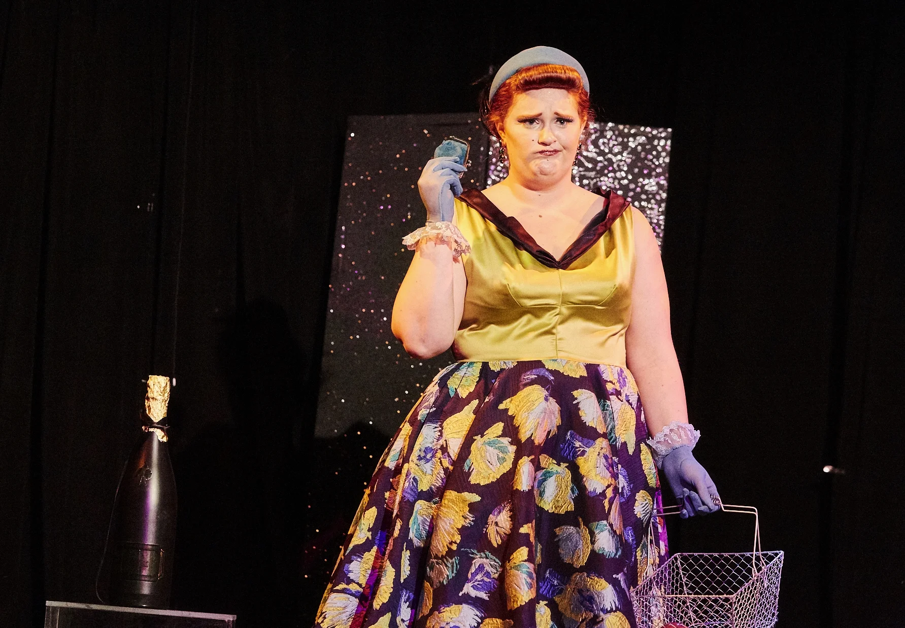 Rita is out for a normal day of shopping, but when she sees a fancy bottle of champagne, she just has to have it. Even though her purse is a little light, she tries to flirt her way to the splurge she covets, and into the audience’s hearts. With a little fosse-inspired posing and Rita’s signature costume reveals, this number is a cute ride through the fantasies of grocery shoppers everywhere.